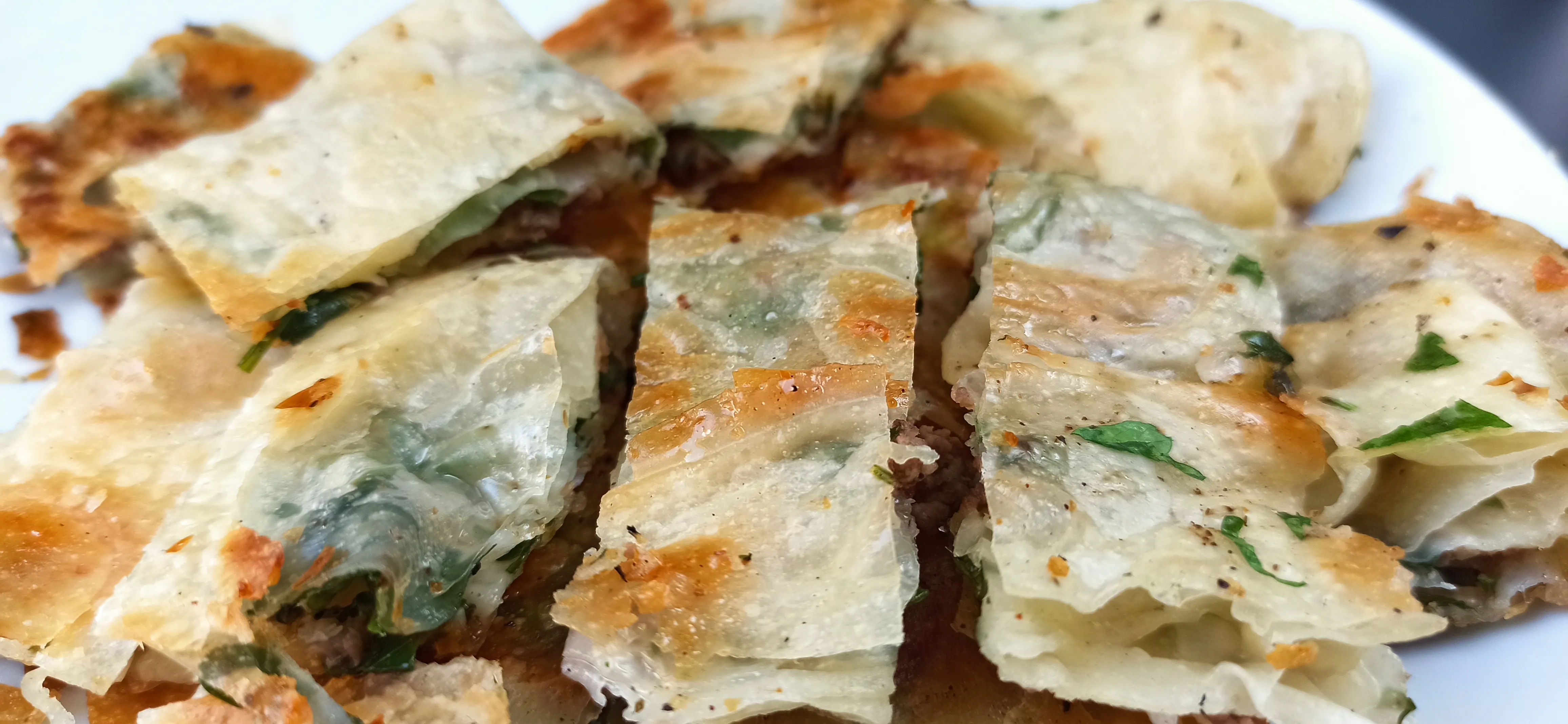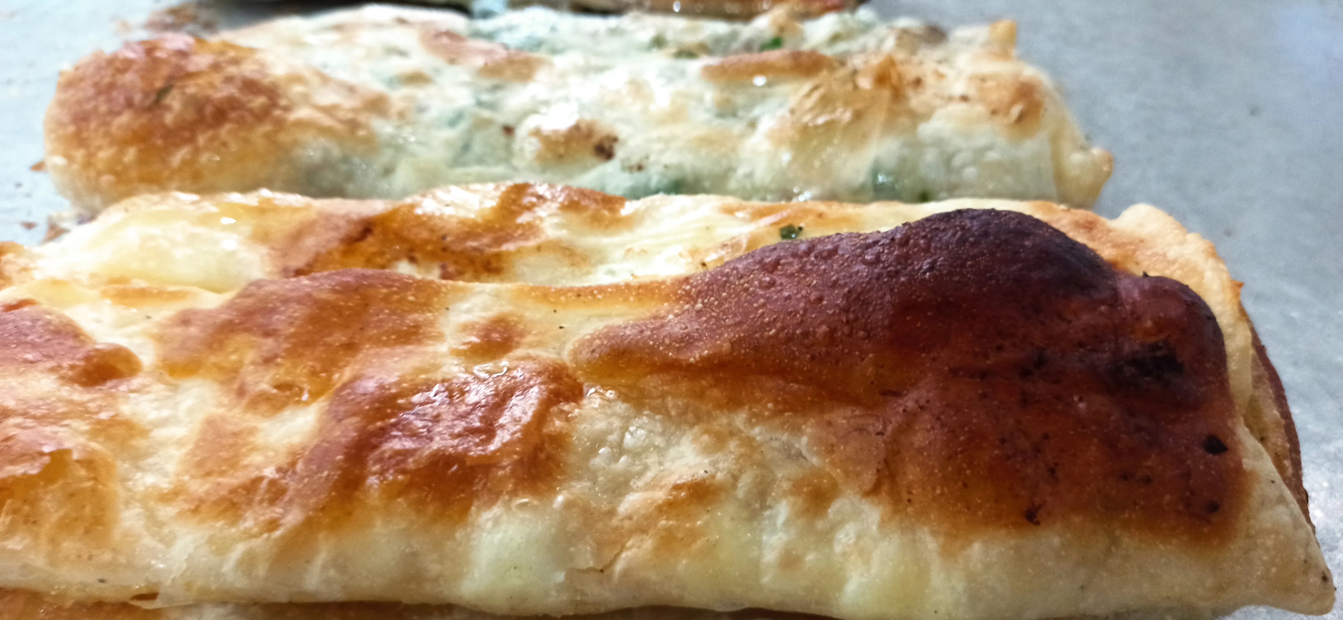 Kağıt gibi altı görünecek şekle gelince tezgahın üzerine yayın ve kenarlarından çekerek genişletin, kenarlarındaki kalın kısımları kopararak alın ( Kalın kısımları almazsanız pişince sert bir şekil alır ) Yufkanızı önce alt tarafından ortaya doğru katlayın. Sonra yanları ortaya doğru katlayın. Ortasına hazırladığınız karışımı dağınık şekilde serpin ( Kıymalı – Peynirli ) Üzerine doğranmış maydonuzu serpin. Karabiber ilave edip kenarlardan ortaya doğru yufkanızı kapatın ve kenarları Parmak uçları ile bastırarak kapatın. Bu işlemleri yaparken elinizi sürekli sade yağ ile yağlamayı unutmayın.