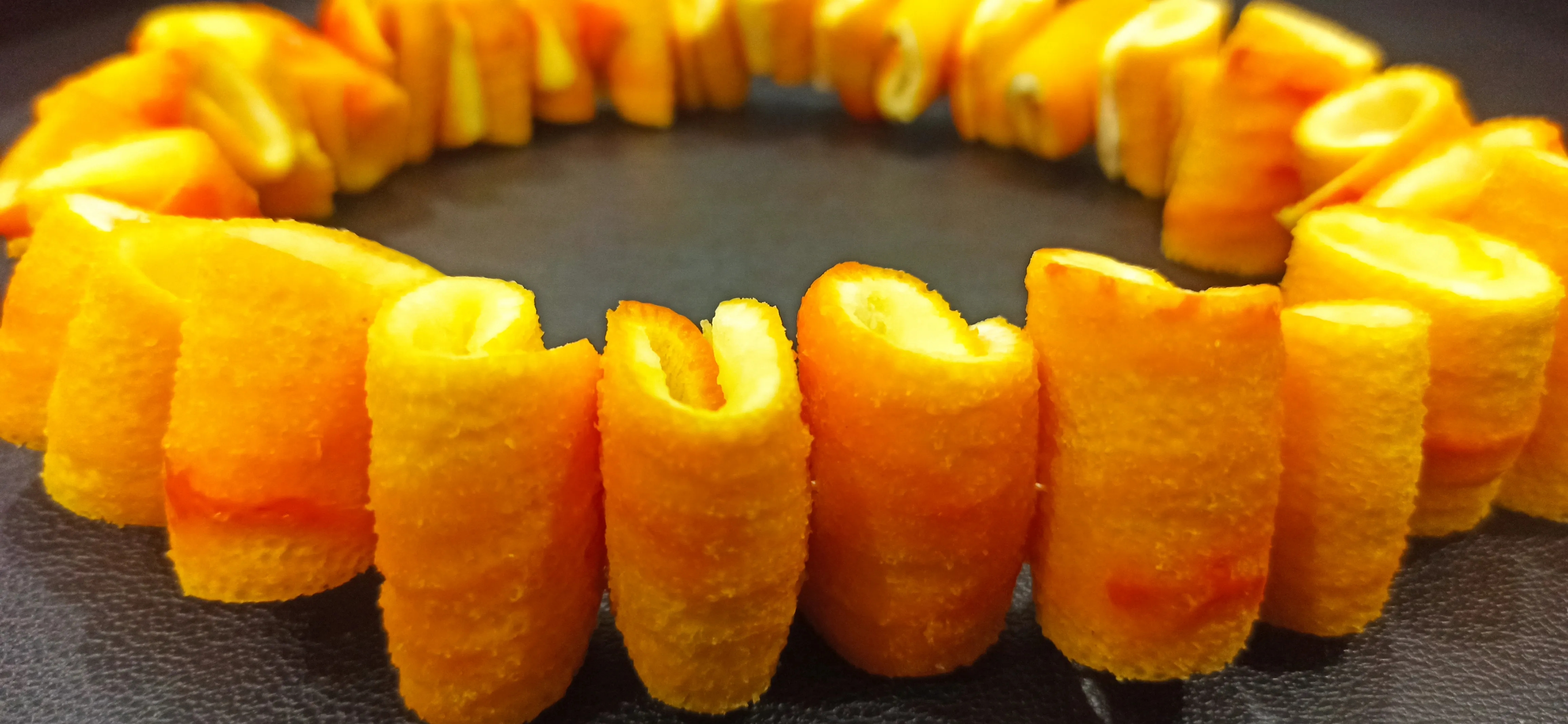 Rendelenen Turunçlarımızı bıçağımızla elma dilimi şeklinde olacak şekilde 6 – 8 parça çıkacak şekilde kesiyoruz. Yukarıdan itibaren yavaş yavaş kabukları gövdeden ayırıyoruz.